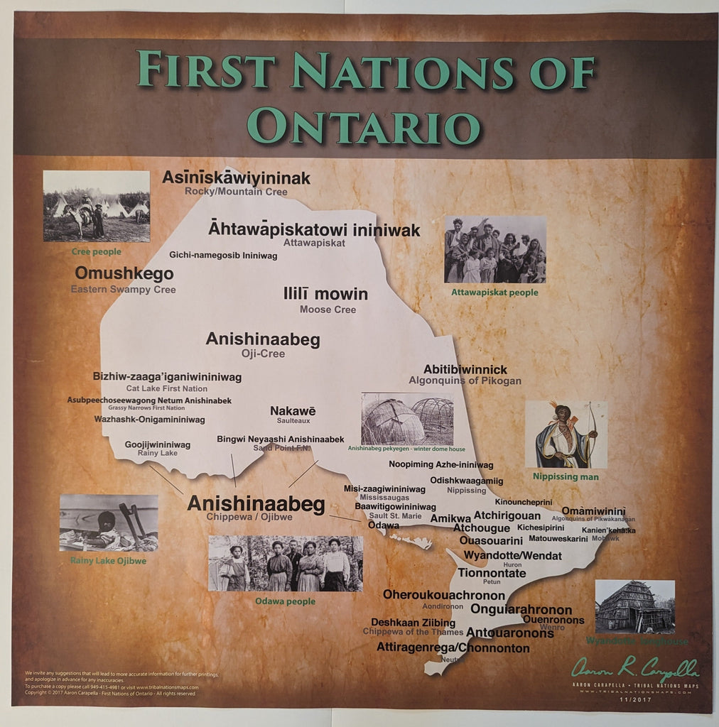 This First Nations tribal map represents the original pre-contact homelands of the hundreds of Tribal Nations that existed across what is now Ontario. Most of the names shown here are the indigenous autonyms that tribes use for themselves. In some cases where the original First Nations tribal name was never recorded, other common names are used. Many First Nations tribes did not survive the invasion by Europeans, yet this map serves as a visual reminder of their memory. This is the first time for many of these First Nations tribes to ever have a place on a map. This is dedicated to all of the Tribal Nations across this land. May it instill pride in Indigenous Peoples and Native Peoples and teach the non-Native public about our First Nations history.