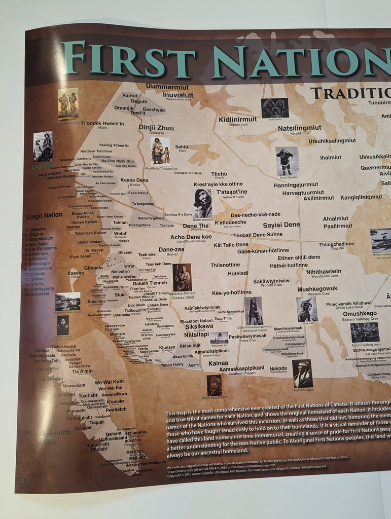 The First Nations and Inuit Map Poster is the first to document the true names and original pre-contact locations of every documented First Nations in what is now Canada. We seek to honor all First Nations Tribes, Inuit tribes and Indigenous Peoples of Canada by including the larger, well-known tribes as well as many that did not survive the effects of European genocide and disease. Most of the First Nations and Inuit tribal names are the correct names used to call themselves in their own languages. The only exception are for those tribes whose languages were never documented. This wall map / poster is a visual reminder of who called this land home for tens of thousands of years before any European set foot and creates a sense of pride for modern-day First Nations and Indigenous Peoples as well as educating the non-Native public. To First Nations and Inuit, this land will always be our ancestral homeland.