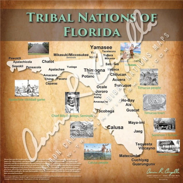 The Tribal Nations of Florida Map represents the original pre-contact homelands of the hundreds of Tribal Nations that existed across what is now Florida. Most of the Native American (American Indian) tribal names shown here are the indigenous autonyms that tribes use for themselves. In some cases where the original name was never recorded, other common names are used. Many Native American tribes did not survive the invasion by Europeans, yet this map serves as a visual reminder of their memory. This is the first time for many of these Native American tribes to ever have a place on a map. This is dedicated to all of the Tribal Nations and Indigenous Peoples across this land. May it instill pride in Native American and Indigenous Peoples and teach the non-Native public about our Native American and Indigenous Peoples history.