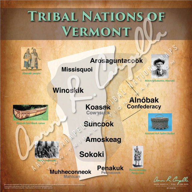 The Tribal Nations of Vermont Map represents the original pre-contact homelands of the hundreds of Tribal Nations that existed across what is now Vermont. Most of the Native American (American Indian) tribal names shown here are the indigenous autonyms that tribes use for themselves. In some cases where the original name was never recorded, other common names are used. Many Native American tribes did not survive the invasion by Europeans, yet this map serves as a visual reminder of their memory. This is the first time for many of these Native American tribes to ever have a place on a map. This is dedicated to all of the Tribal Nations and Indigenous Peoples across this land. May it instill pride in Native American and Indigenous Peoples and teach the non-Native public about our Native American and Indigenous Peoples history.