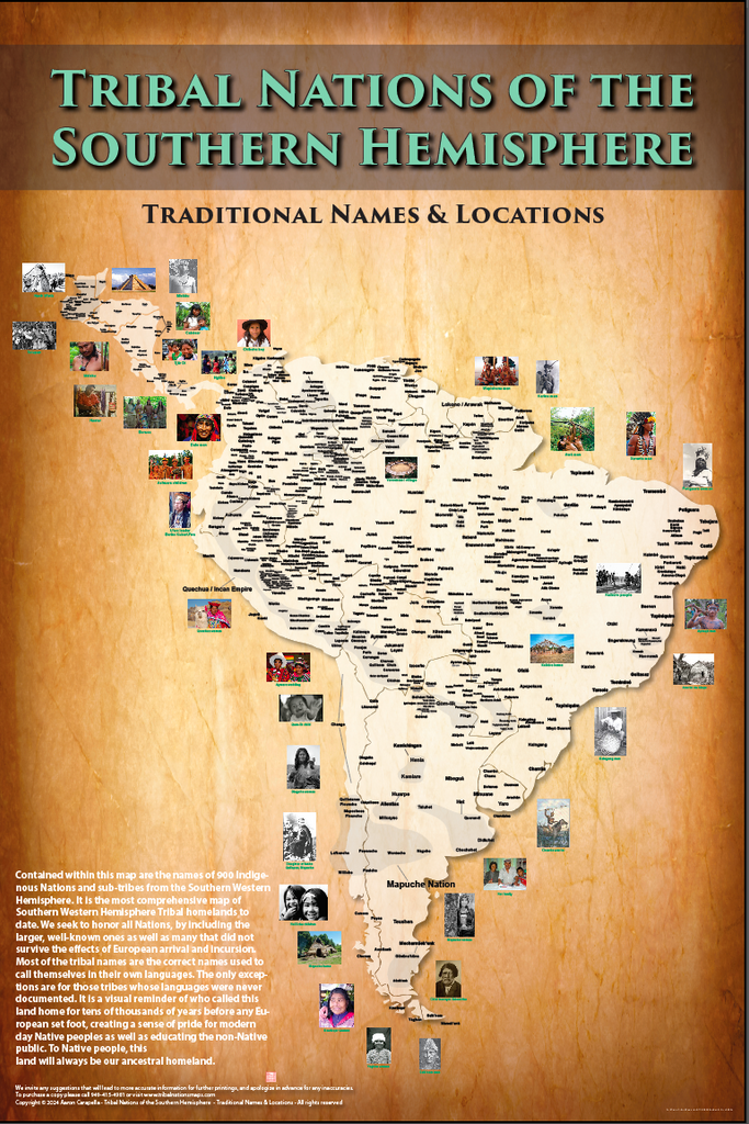 This map represents the original pre-contact homelands of the hundreds of Tribal Nations that existed across the southern hemisphere. Most of the names shown here are the indigenous autonyms that tribes use for themselves. In some cases where the original name was never recorded, other common names are used. Many tribes did not survive the invasion by Europeans, yet this map serves as a visual reminder of their memory. This is the first time for many of these tribes to ever have a place on a map. This is dedicated to all of the Nations across this land. May it instill pride in Native People and teach the non-Native public about our history.