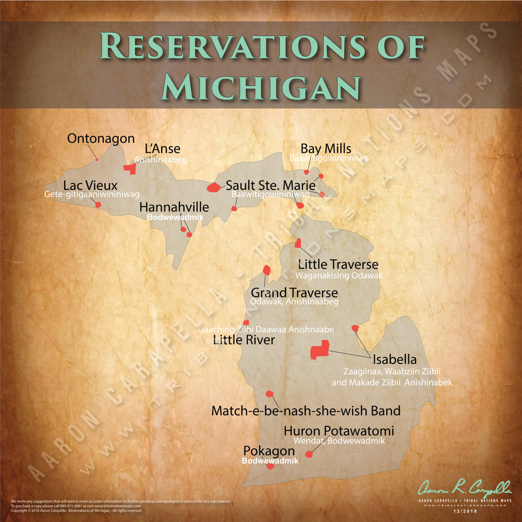 This map of Indian Reservations in Michigan documents the areas and locations of documented Native American (American Indian) reservations and tribal jurisdictions in what is now known as the state of Michigan. This map is a visual reminder of what the people who called this land home, were left with in the post-European contact world. To Native Americans and Indigenous Peoples, this land will always be our ancestral homeland.