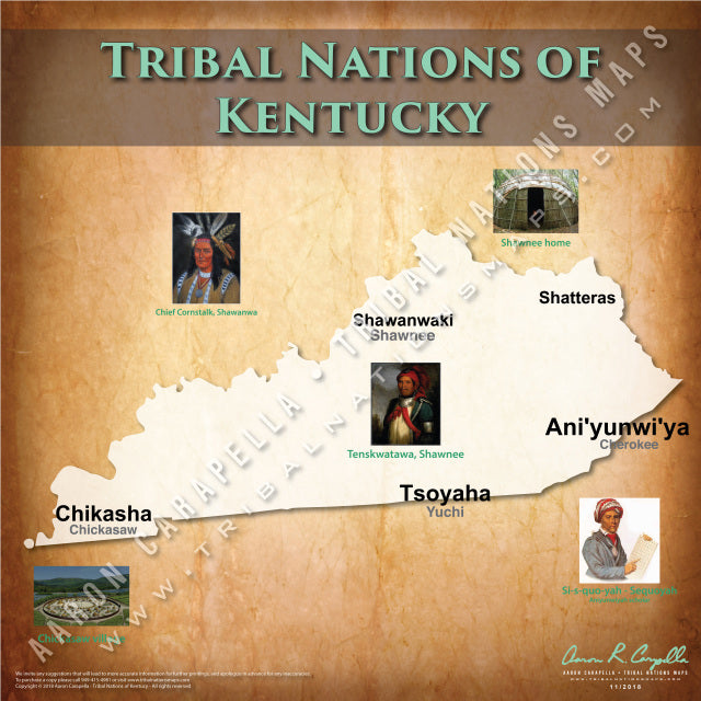 The Tribal Nations of Kentucky Map represents the original pre-contact homelands of the hundreds of Tribal Nations that existed across what is now Kentucky. Most of the Native American (American Indian) tribal names shown here are the indigenous autonyms that tribes use for themselves. In some cases where the original name was never recorded, other common names are used. Many Native American tribes did not survive the invasion by Europeans, yet this map serves as a visual reminder of their memory. This is the first time for many of these Native American tribes to ever have a place on a map. This is dedicated to all of the Tribal Nations and Indigenous Peoples across this land. May it instill pride in Native American and Indigenous Peoples and teach the non-Native public about our Native American and Indigenous Peoples history.