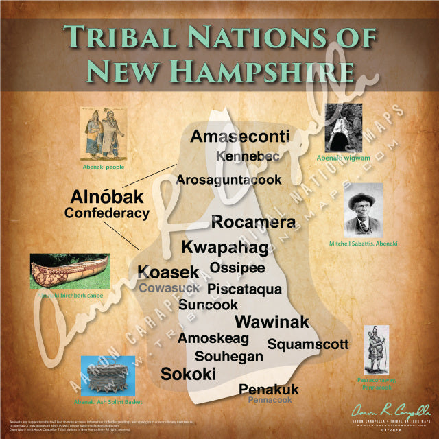 The Tribal Nations of New Hampshire Map represents the original pre-contact homelands of the hundreds of Tribal Nations that existed across what is now Hampshire. Most of the Native American (American Indian) tribal names shown here are the indigenous autonyms that tribes use for themselves. In some cases where the original name was never recorded, other common names are used. Many Native American tribes did not survive the invasion by Europeans, yet this map serves as a visual reminder of their memory. This is the first time for many of these Native American tribes to ever have a place on a map. This is dedicated to all of the Tribal Nations and Indigenous Peoples across this land. May it instill pride in Native American and Indigenous Peoples and teach the non-Native public about our Native American and Indigenous Peoples history.