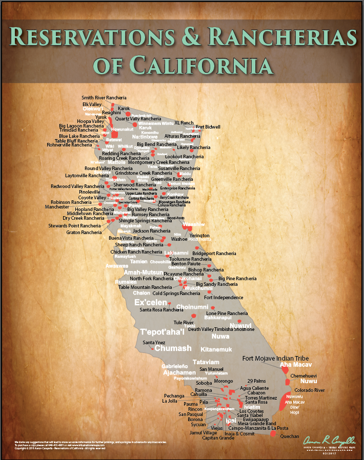 This map of Indian Reservations in California documents the areas and locations of documented Native American (American Indian) reservations and tribal jurisdictions in what is now known as the state of California. This map is a visual reminder of what the people who called this land home, were left with in the post-European contact world. To Native Americans and Indigenous Peoples, this land will always be our ancestral homeland.