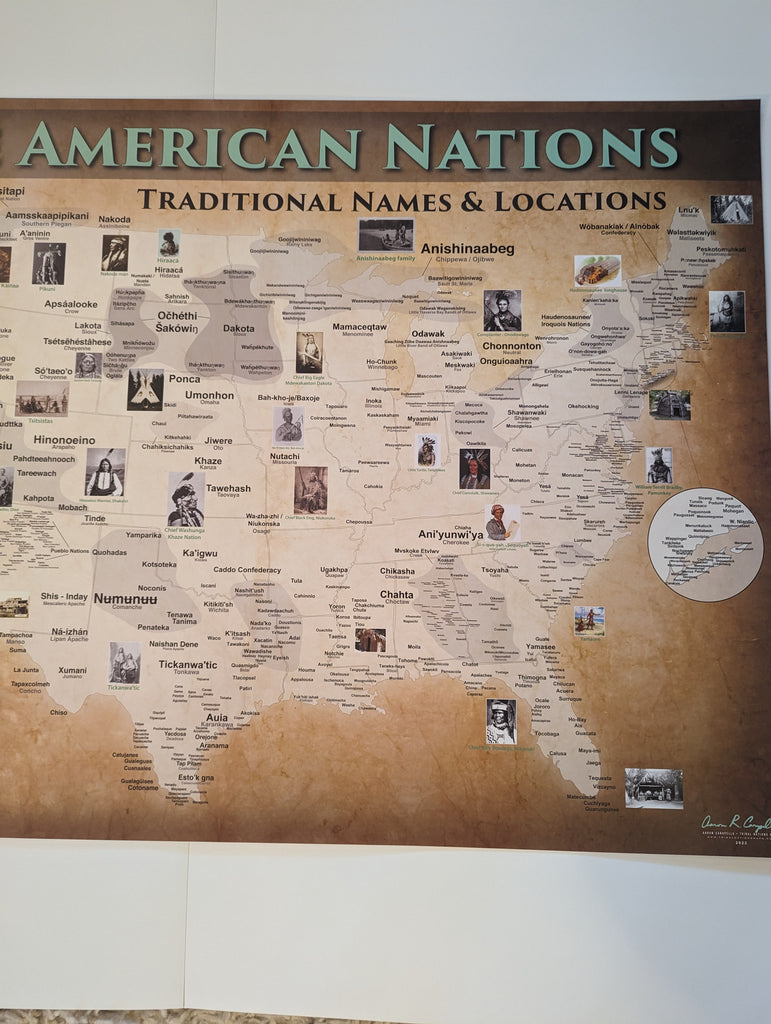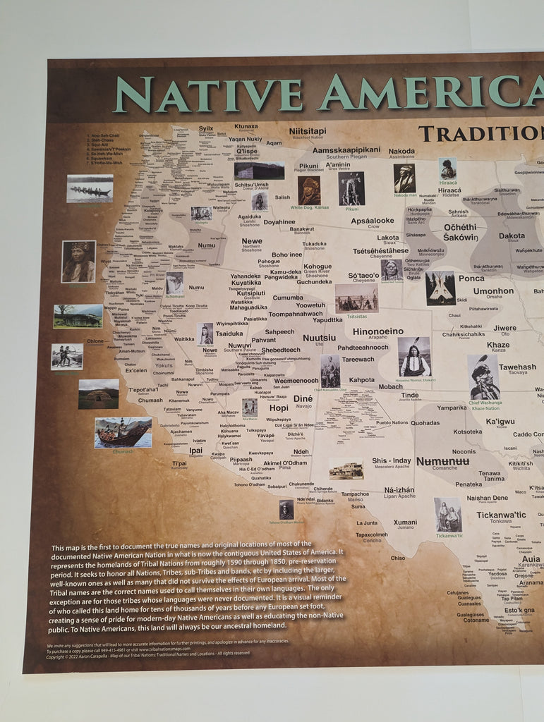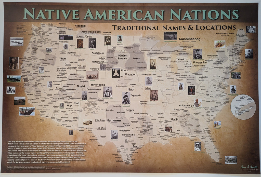The Native American / American Indian Map Poster is the first to document the true names and original pre-contact locations of every documented Native American Tribal Nation in what is now the contiguous United States of America. We seek to honor all Native American tribes and Indigenous Peoples, by including the larger, well-known Native American tribes as well as many that did not survive the effects of European genocide and disease. Most of the Native American tribal names are the correct names used to call themselves in their own languages. The only exception are for those tribes whose languages were never documented. This wall map / poster is a visual reminder of who called this land home for tens of thousands of years before any European set foot and creates a sense of pride for modern-day Native Americans and Indigenous Peoples as well as educating the non-Native public. To Native Americans, this land will always be our ancestral homeland.