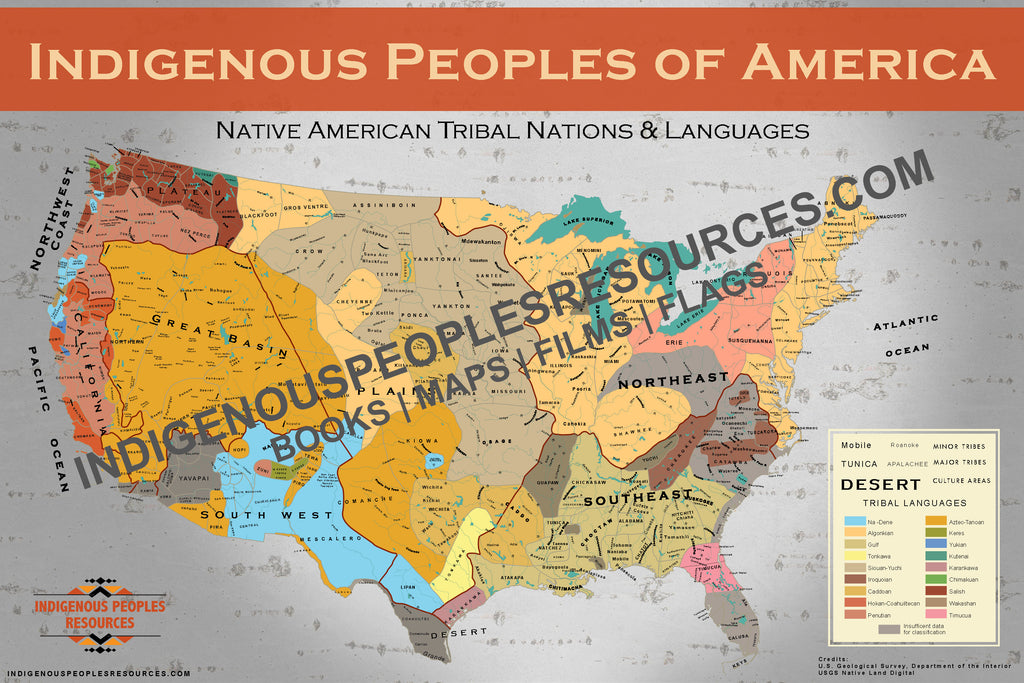 The content of this map is comprised from the work of many historians, educators and archivists that have worked tirelessly to preserve the history of Indigenous Peoples around the world. This map is a visual reminder of who called this land home for tens of thousands of years before any European set foot and to provide a reference for the location of each tribe. Tribal languages have been included to help identify cultural ties between many of the tribal nations that lived in the same or neighboring regions. In many cases, information regarding the original names, locations and tribal languages of Native Americans can be difficult to find and historians continue to document new information and this map is a reflection of the most current information we were able to find.