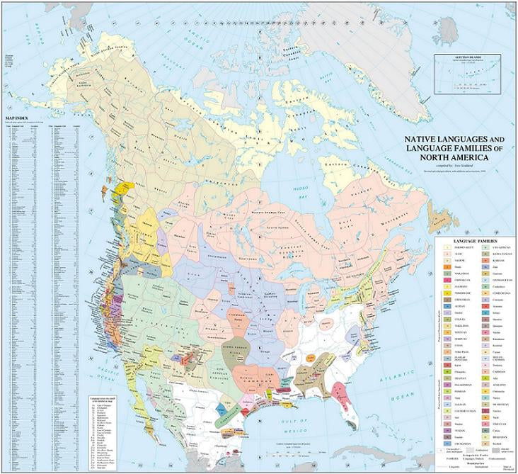 Native American map of North America that shows the locations and distribution of the known Native languages spoken by Indigenous peoples across North America at the time of first European invasion/contact. Native languages and language families are grouped and color-coded. The map size is 22"x20" when unfolded (map ships folded).