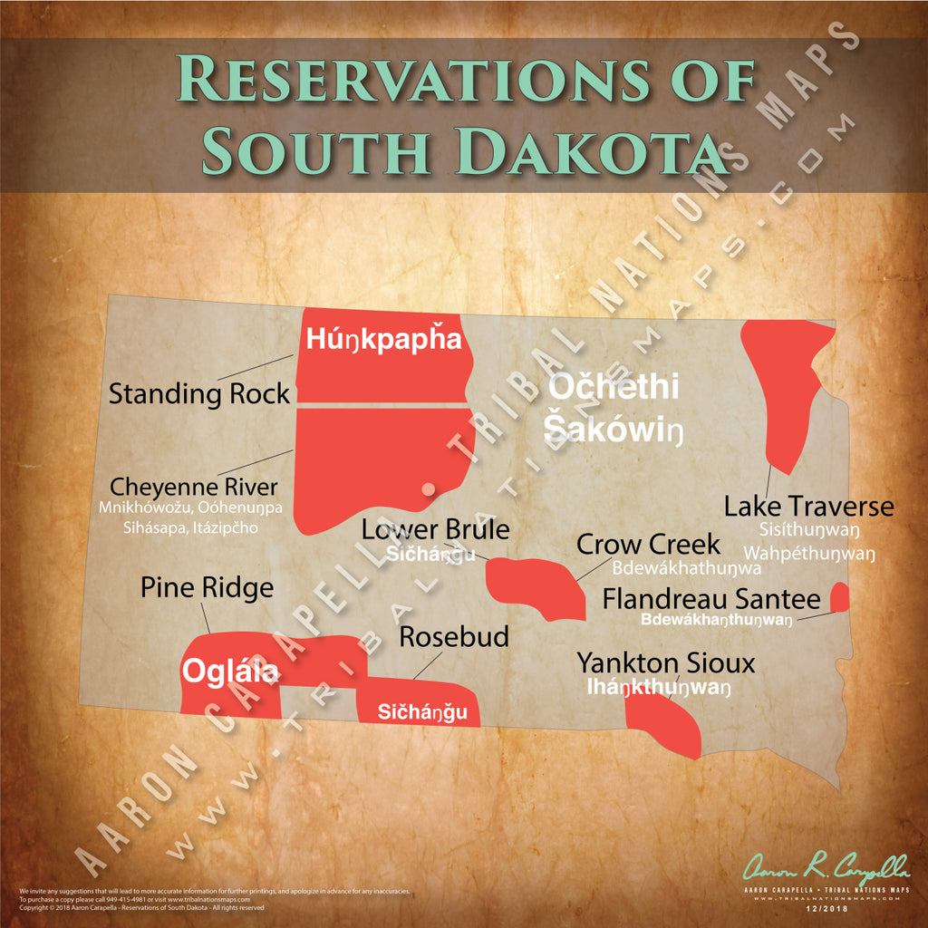This map of Indian Reservations in South Dakota documents the areas and locations of documented Native American (American Indian) reservations and tribal jurisdictions in what is now known as the state of South Dakota. This map is a visual reminder of what the people who called this land home, were left with in the post-European contact world. To Native Americans and Indigenous Peoples, this land will always be our ancestral homeland.