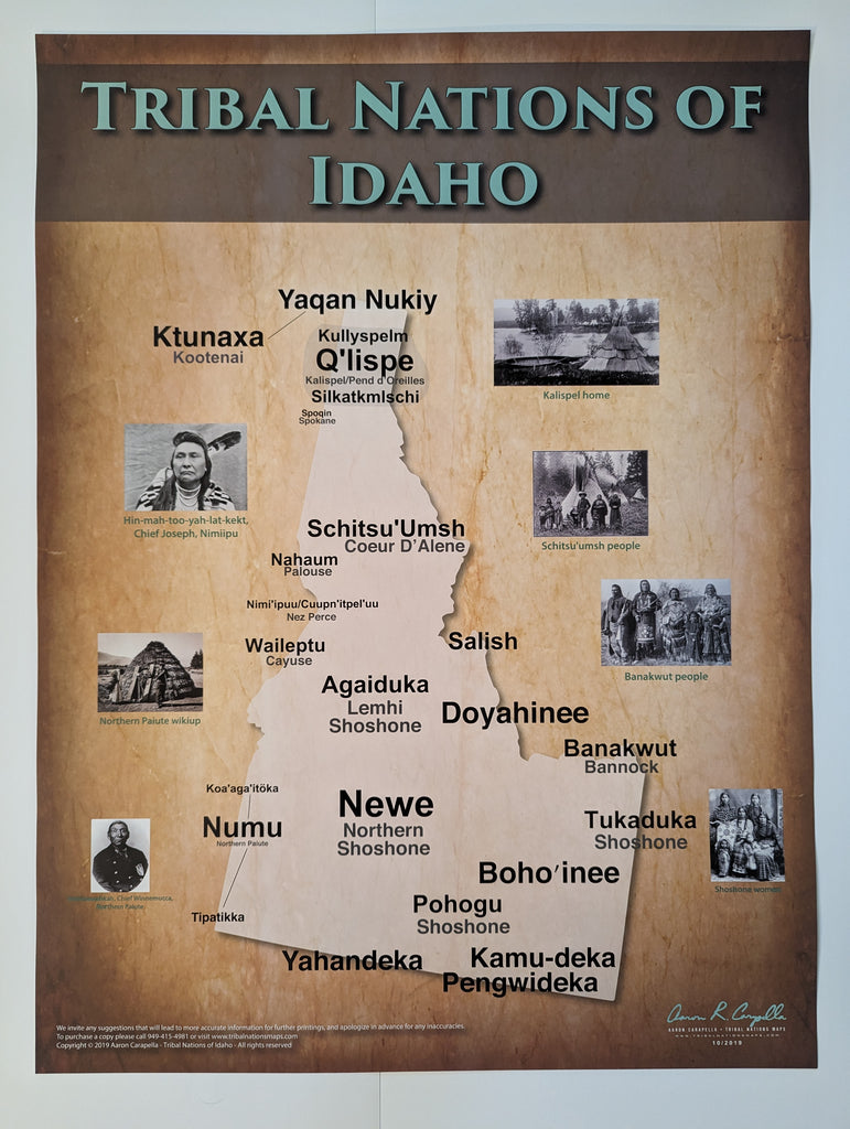 The Tribal Nations of Idaho Map represents the original pre-contact homelands of the hundreds of Tribal Nations that existed across what is now Idaho. Most of the Native American (American Indian) tribal names shown here are the indigenous autonyms that tribes use for themselves. In some cases where the original name was never recorded, other common names are used. Many Native American tribes did not survive the invasion by Europeans, yet this map serves as a visual reminder of their memory. This is the first time for many of these Native American tribes to ever have a place on a map. This is dedicated to all of the Tribal Nations and Indigenous Peoples across this land. May it instill pride in Native American and Indigenous Peoples and teach the non-Native public about our Native American and Indigenous Peoples history.