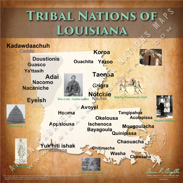 The Tribal Nations of Louisiana Map represents the original pre-contact homelands of the hundreds of Tribal Nations that existed across what is now Louisiana. Most of the Native American (American Indian) tribal names shown here are the indigenous autonyms that tribes use for themselves. In some cases where the original name was never recorded, other common names are used. Many Native American tribes did not survive the invasion by Europeans, yet this map serves as a visual reminder of their memory. This is the first time for many of these Native American tribes to ever have a place on a map. This is dedicated to all of the Tribal Nations and Indigenous Peoples across this land. May it instill pride in Native American and Indigenous Peoples and teach the non-Native public about our Native American and Indigenous Peoples history.